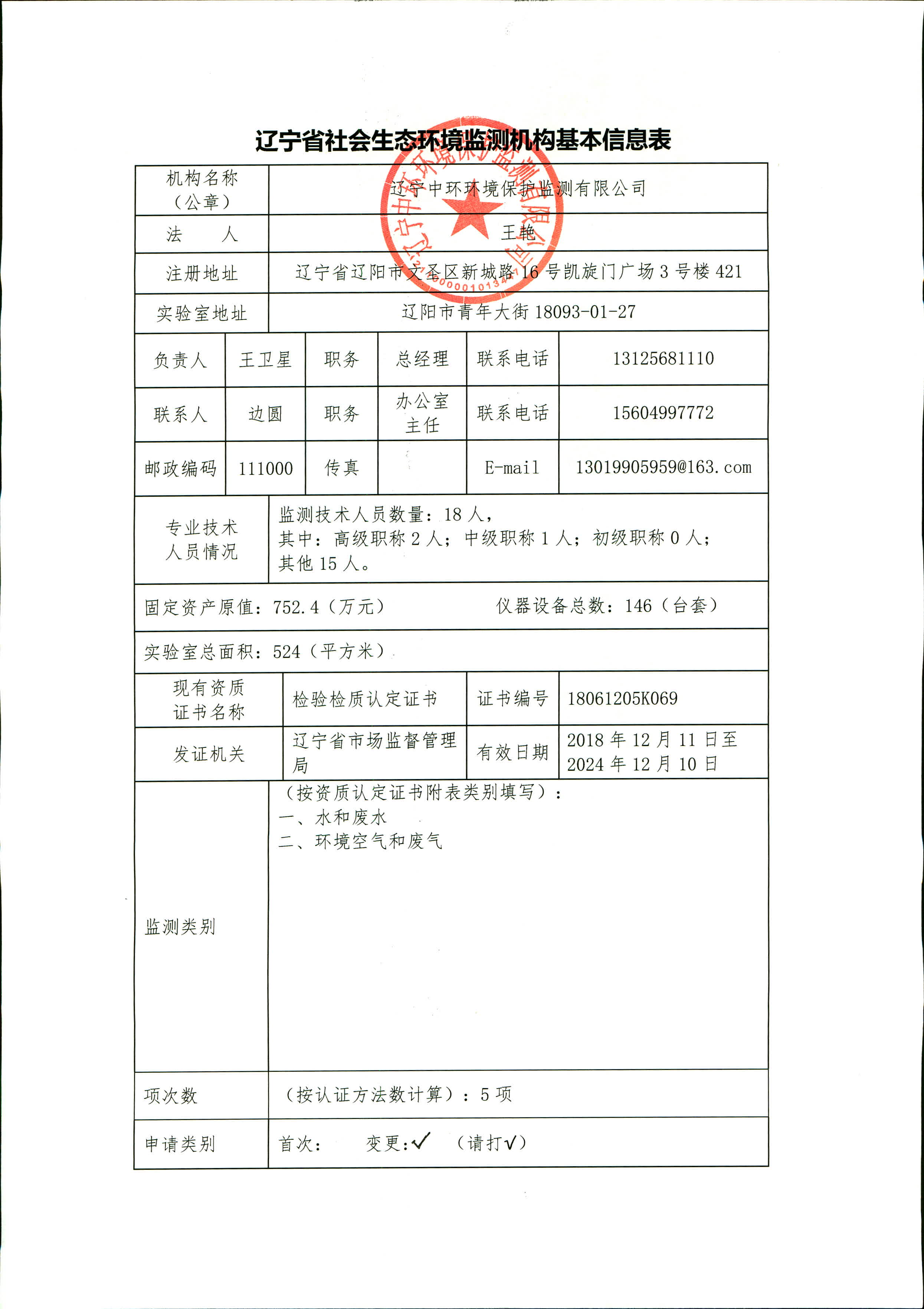辽宁中环环境保护监测有限公司作为社会生态环境监测机构应文件要求向社会公开基本信息,如附件。